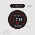 Each label, sold separately, includes a front and rear cap indicator for Canon RF lenses, displaying focal length, aperture, filter size, and lens designations. Crafted in Montreal, Canada, from durable, UV and scratch-resistant matte vinyl from North America with outdoor rated adhesive, these indicators offer lasting performance and a sleek, professional appearance.