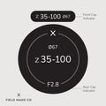 Indicateurs individuels premium pour capuchons avant et arrière d’objectif, indiquant la focale, l’ouverture, le diamètre du filtre et les désignations de l’objectif.