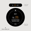 Indicateurs individuels premium pour capuchons avant et arrière d’objectif, indiquant la focale, l’ouverture, le diamètre du filtre et les désignations de l’objectif.