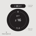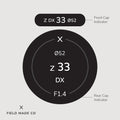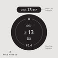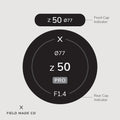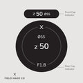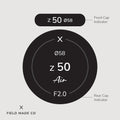 - Rear indicators feature the filter size, focal length, aperture & lens designations.