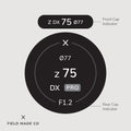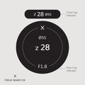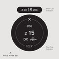 Each label, sold separately, includes a front and rear cap indicator for Viltrox - Nikon Z lenses, displaying focal length, aperture, filter size, and lens designations. Crafted in Montreal, Canada, from durable, UV and scratch-resistant matte vinyl from North America with outdoor-rated adhesive, these indicators offer lasting performance and a sleek, professional appearance.